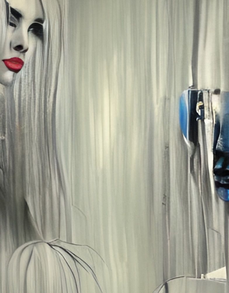 A mesmerising fusion of surrealism and digital abstraction, this artwork presents two enigmatic figures emerging from a cascade of distortion. One face, strikingly human with red lips and piercing eyes, contrasts with the other - an almost robotic presence adorned with metallic blue hues. Their forms dissolve into the background, as if caught between dimensions, creating a haunting interplay between reality and illusion. This work explores themes of identity, transformation and the ever-blurring line between humanity and artificiality, leaving the viewer enchanted by its haunting beauty.