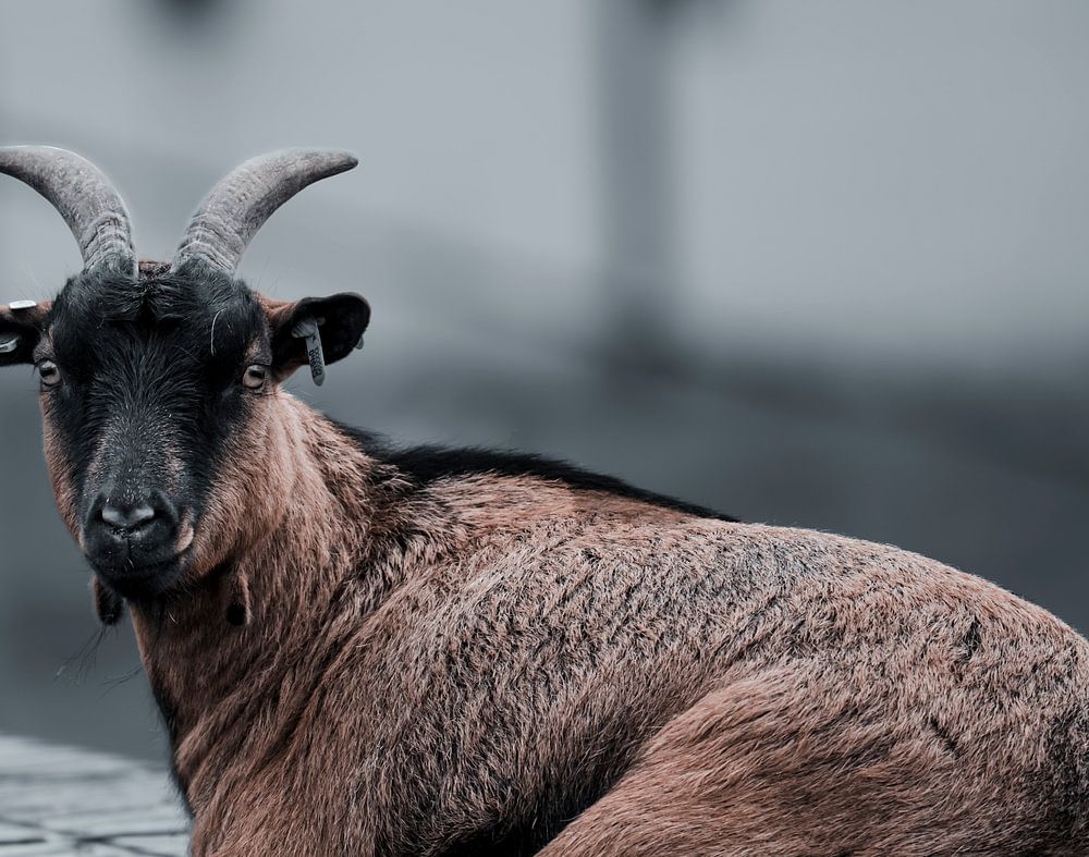 In a hushed scene of tranquillity, a goat lies relaxed on a country table. Her fur forms a warm contrast to the weathered wood of the table as she enjoys the stillness of her surroundings.