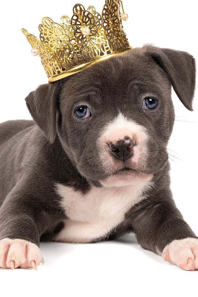 A small grey American Bully or Bulldog puppy with a crown on the head against a white background.Leoniek van der Vliet Six cute  white and brown rats sitting in a stil life scene themed baking cake green backgroundLeoniek van der Vliet