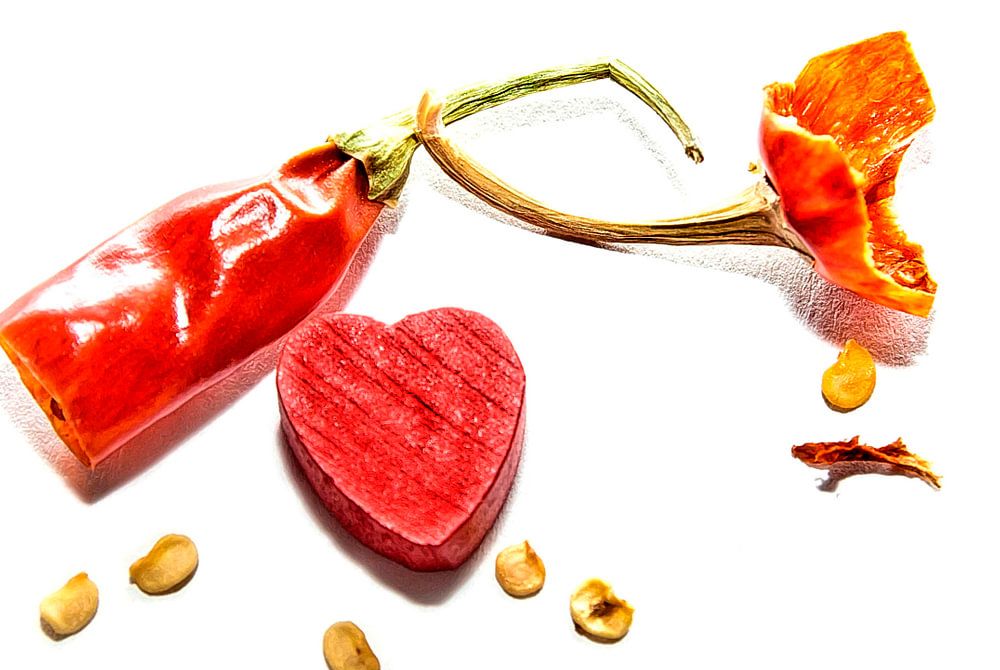 Buy this still life A heart is burning sometimes hotter than chilli. by Norbert Sülzner on canvas, ArtFrame, poster and wallpaper, printed on demand in high quality