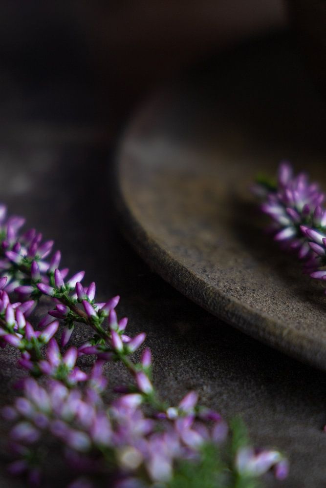 In the foreground, a few sprigs of purple heather and a weathered, rusty sign depict a hushed scene. The delicate flowers provide a gentle contrast to the rough ground. The Heath appears to have been laid down almost carelessly, yet it tells a story of attention to detail. Scattered here and there are small, loose flowers as if they have just fallen. In the background, a fig with its deep purple colour looms subtly and balances the composition. The whole breathes tranquillity and simplicity, but the colour contrasts and the interplay between the rough and the soft create a special depth in the picture.