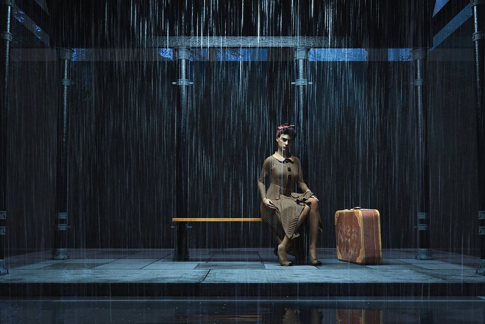 A Lonely Goodbye is a narrative work in which you see a woman sitting on a bench in the bus stop. Next to her is a brown suitcase. The weather is rainy, puddles are forming on the road, and the lighting of the bus shelter also looks desolate. Judging by the lack of daylight, the sun is either just rising or just setting.