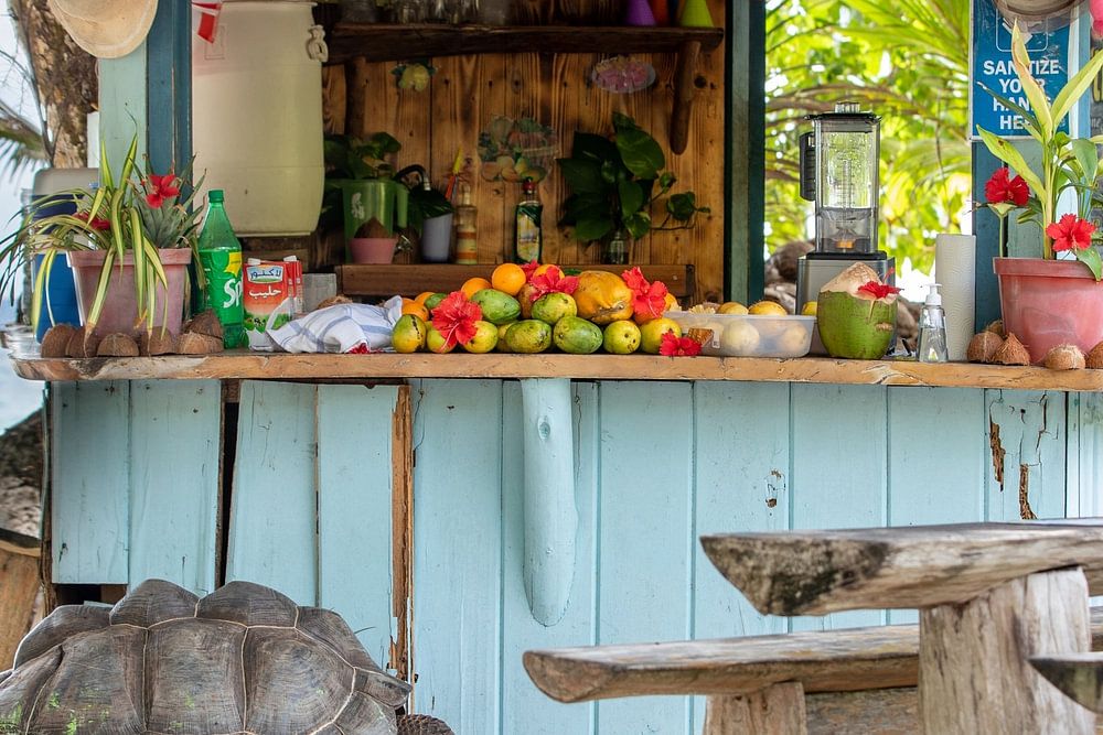 This giant turtle is the only guest at the beach bar at Anse Severe (also called Turtle Beach) on La Digue (Seychelles) around noon.