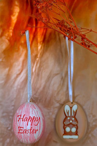 Two decorative Easter eggs hang from white ribbons attached to a delicate, reddish-shimmering twig. The egg on the left is patterned in a soft pink and bears the greeting ‘Happy Easter’ in sweeping red lettering, whilst the egg on the right features a cute chocolate bunny. The warm, softly rendered background in shades of beige and gold…