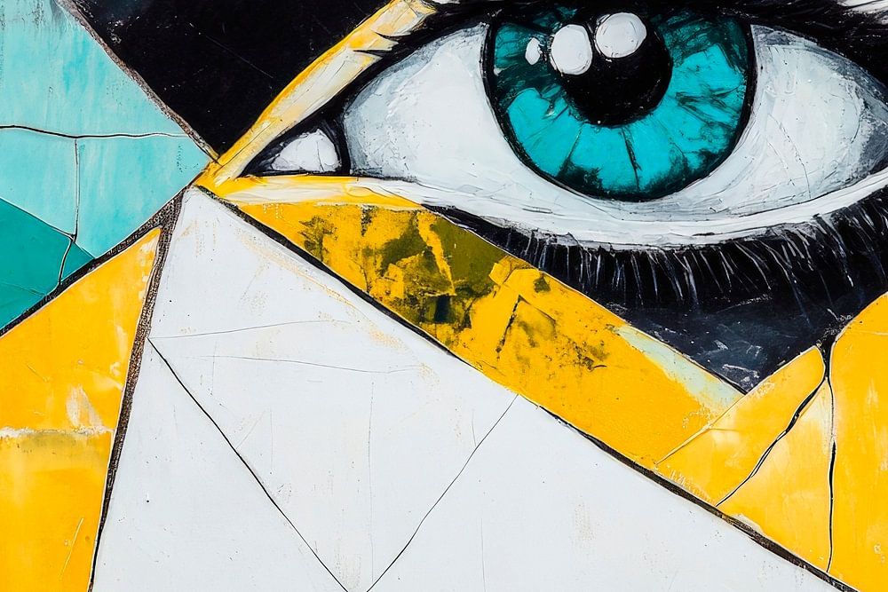 A fascinating interplay of geometric shapes and vibrant colours casts a spell over the viewer. The mesmerising look of an eye, surrounded by sharp, contrasting mosaic fragments, gives the room an inspiring atmosphere. Perfect for a creative office or a modern living room where creativity and style merge harmoniously.