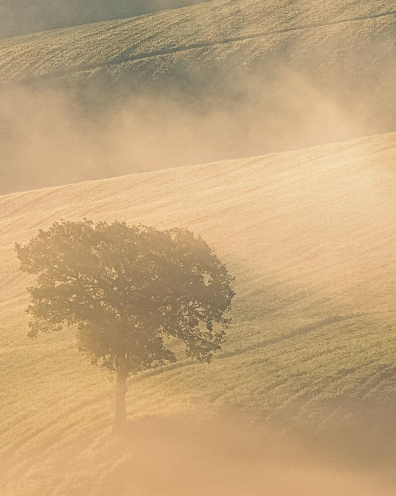 A vertical 4:5 photograph with warm tones of a lone tree during sunrise with a layer of fog in Tuscany, in Val d'Orcia, in central Italy.