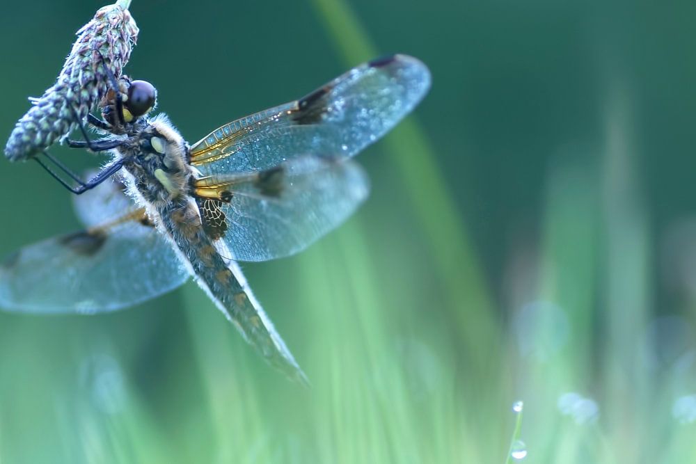 Because there are few dragonflies in my area, you sometimes have to travel quite a distance. And if you want to photograph the dragonflies when they are still sitting still, you will have to be present at sunrise. For this photo I left a day in advance and spent the night in a hotel in the area. On the morning in question, I got up very early and left for the nature reserve. Because it was quite windy, the dragonflies were well hidden between the plants. The sun had already risen nicely orange, but we still hadn't found the dragonflies. But as the temperature rose they did show up! The many dewdrops and the fine morning light, provided a beautiful image. A morning like a fairy tale.