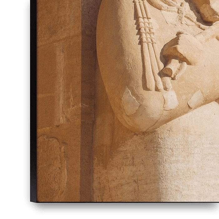 This artwork shows a close-up of a statue of a pharaoh in Egypt. This beautiful statue is the god Osiris.