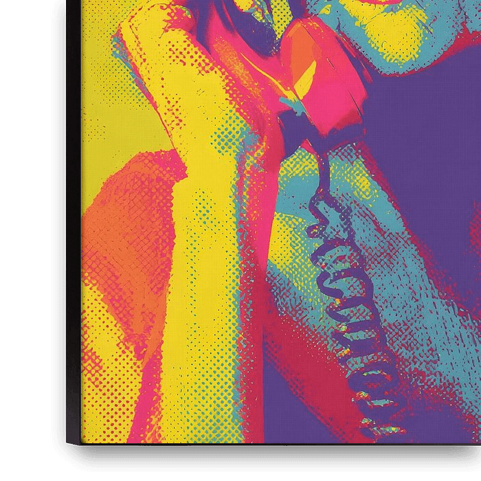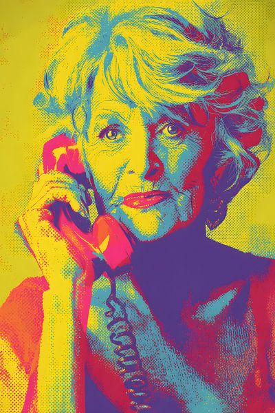 A vibrantly coloured Pop Art portrait depicts an elderly woman with a telephone receiver to her ear. The exaggerated colours – yellow, turquoise, magenta and red – create strong contrasts and lend the image a striking dynamism. Her gaze appears attentive and slightly sceptical, as if she were listening to an important or unexpected…