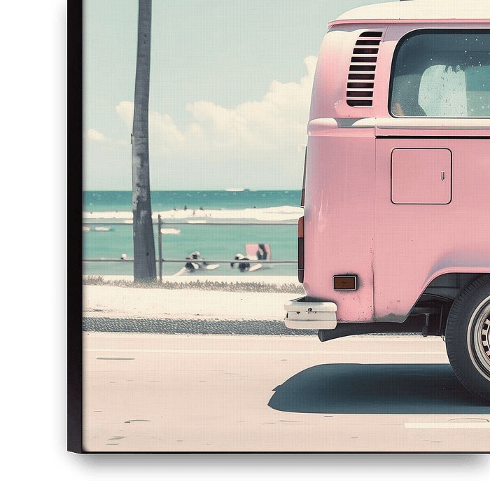 A retro-style poster of a pink bus parked at the roadside to the beach. Palm trees and the beach are seen in the background.