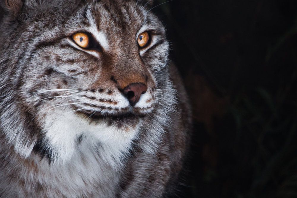A proud sitting lynx with orange eyes on a dark background of grass.