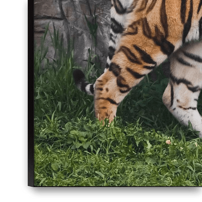 Buy the photo A proud, sleek tiger stands beautifully against a stone cliff. Beautiful powerful big tiger cat (Amu by Michael Semenov on canvas, ArtFrame, poster and wallpaper, printed on demand in high quality.