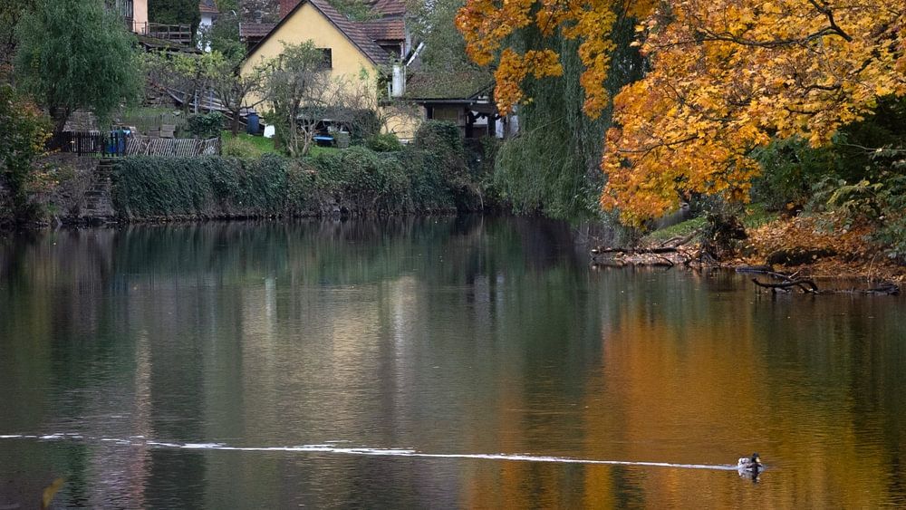 A duckling swims on a calm stream in a remote corner of the city of Prague. Taken on a calm day in autumn.