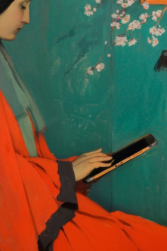 The scene unfolds in a calm, timeless mood: a woman in bright red sinks into the pages of a book, enveloped in soft light and the calming mint green of the wall. Her elegant silhouette is framed by delicate flowering branches that fill the room with a sense of grace and peace.
