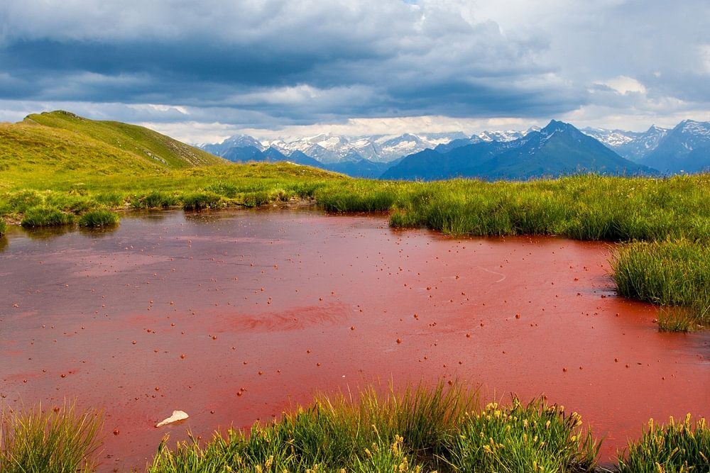 A small puddle of water with an iron content shows up blood red, embedded in the green grass.