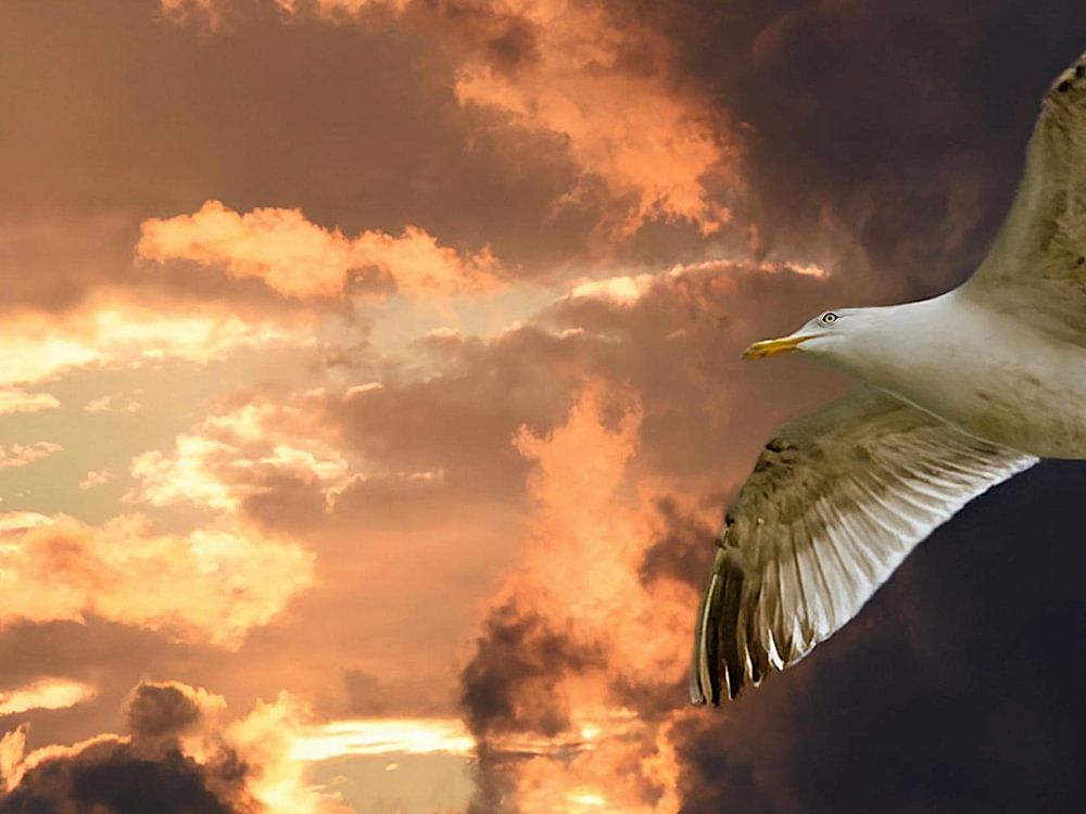 The golden hour, with whimsical clouds and a seagull flying out of the darkness towards the setting sun with its wings spread wide.