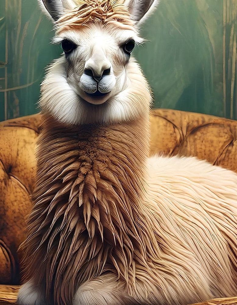 This composition shows a llama with a haughty head sitting comfortably and perfectly at ease in a very chic armchair in a luxurious art deco setting. This image, which might lead you to smile, exudes a warm, original and unexpected atmosphere. The llama's posture highlights the great dignity of this animal, which is both exotic to our shores and very friendly. Surprise, amusement and respect for this noble animal could be the feelings induced by this image.