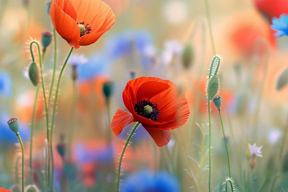 This image of a field filled with vibrant poppies and cornflowers captures an essence of serene beauty and natural simplicity. The soft focus and dreamy quality of the light enhance the enchanting atmosphere, making it a perfect addition to any space that craves a touch of tranquillity and natural splendour. Ideal for both modern and traditional interiors, this image adds an element of tranquillity and inspiration to your home or office.