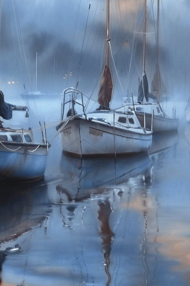 Sailboats glide almost weightlessly across the water, their movement blurred in a subtle blur that evokes a sense of abstraction and creativity.