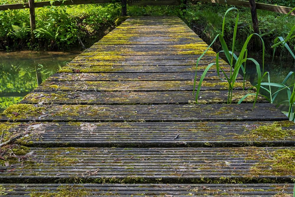 I found this little bridge with some moss on it over a small lake on a sunny spring day in Belgium, you can also see some reflection in the water.