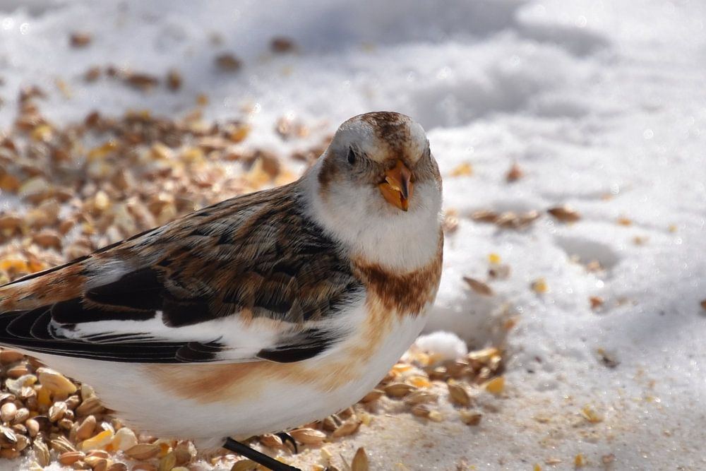 A snow bunting in winter, Sainte-Apolline Quebec, Canada