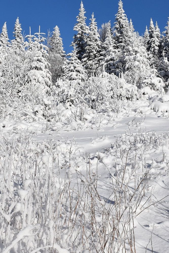 A snowy forest under a blue sky, Sainte-Apolline, Quebec, Canada