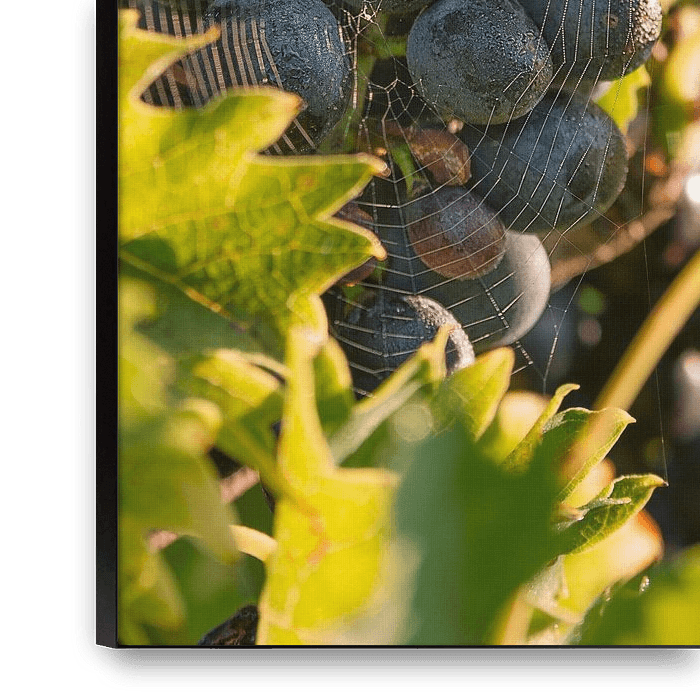 Buy this landscape artwork A spiderweb hangs from red grapes on a vine by Edith Albuschat on canvas, ArtFrame, poster and wallpaper, printed on demand in high quality.