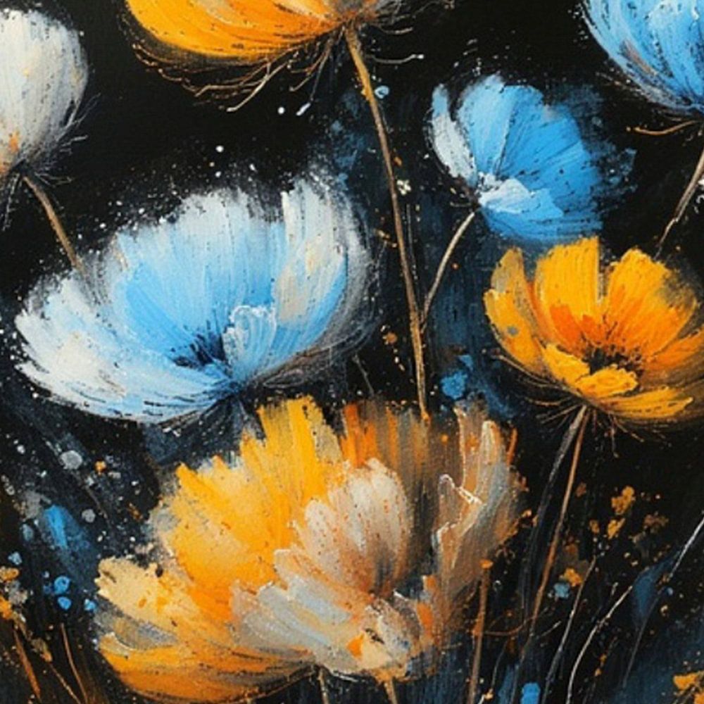 A still life including soft field flowers in yellow white blue with light on a black background . Infused with fairy tales, magic, light, country style and flowers.