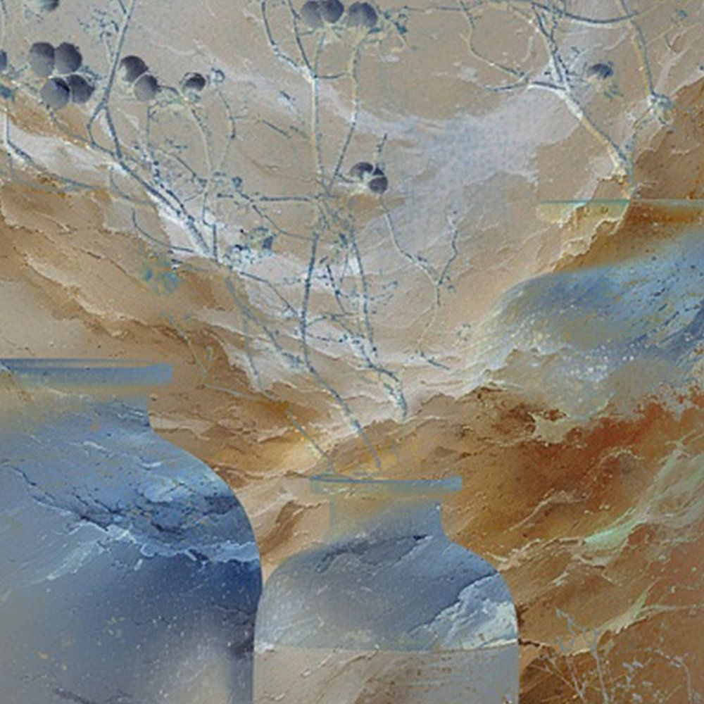 a still life of a trio of large earthenware pots vases and small pot next to them standing with cotton plants in pastel blue beige brown fading colour translucent almost glass mixed alluded to wabi sabi and art nature. modern art/modern era/soft/