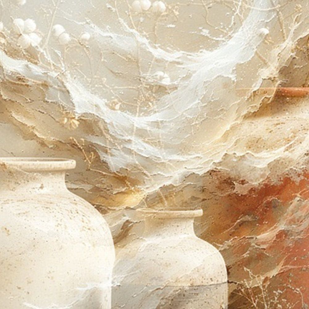 a still life of vases pots pottery of soft beige white colours and rust brown red with white cotton flowers and mist fabric paint decorated on a soft beige white background alluded to country style , modern style , wabi sabi nature.
