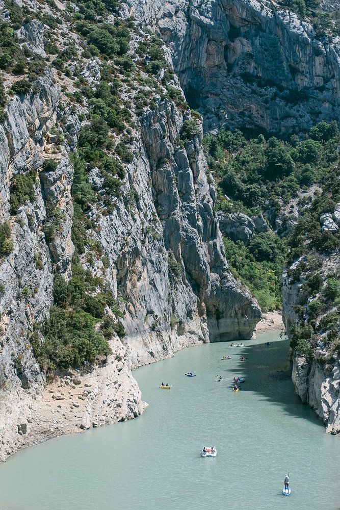 On a hot, summer vacation day, enjoy cooling off on the water at Gorges du Verdon. A beautiful gorge with clear blue water in the mountains of Provence, France. Swimming, supping, by canoe or pedal boat. It can all be done there.