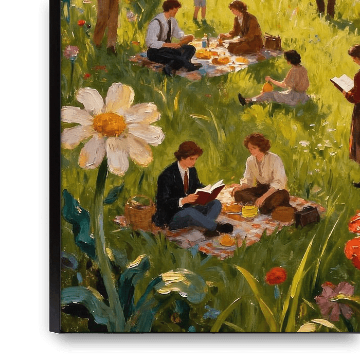 A colourful and vibrant painting depicting people in a blossoming meadow. Large, intricately detailed flowers dominate the scene, creating an almost fairy-tale atmosphere. Families, children and couples are enjoying the outdoors – some are reading, others are playing or having a picnic. The warm shades of yellow and green convey a sense…