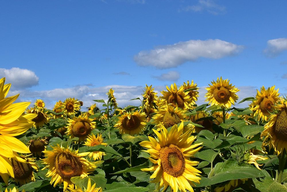 A sunflower field under a blue sky, La Pocatiere, Quebec, Canada