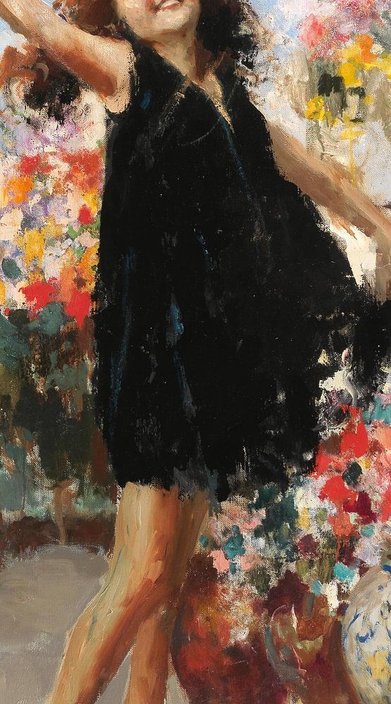 This young lady toasts with a glass of white wine in hand. The girl wears a summer black dress and stands in front of cheerful and bright flowers in flower pots.