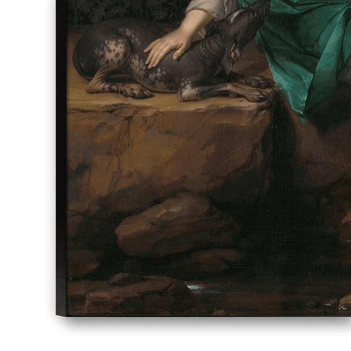 A woman with a dog, Herman van der Mijn, 1719 oil on panel, h 49cm × w 39.2cm × d 5.5cm. More object details Van der Mijn, born in Amsterdam, arrived in London via Düsseldorf and Antwerp, where he built a successful career with finely painted portraits and tableaux. These almost always depict a female figure in a landscape, sometimes with a reference to a story from the Bible or classical mythology. It is not known whether this woman too is a religious or mythological figure.
