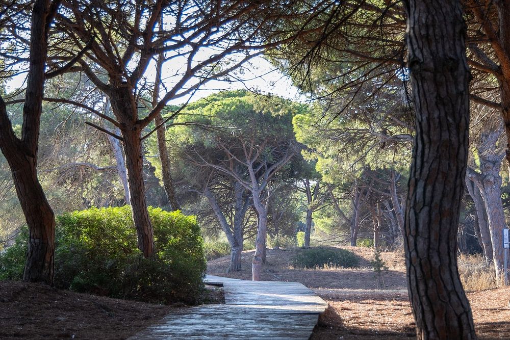 A wooden walkway winds through a Mediterranean pine forest, nature reserve, Pinar De La Almadraba, Pinares De Rota, Rota, Cádiz, Andalusia, Spain by Fotos by Jan Wehnert