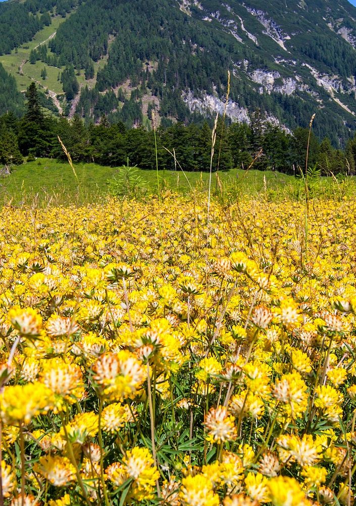 A yellow flower meadow and the Benzeck in Flachauwinkl