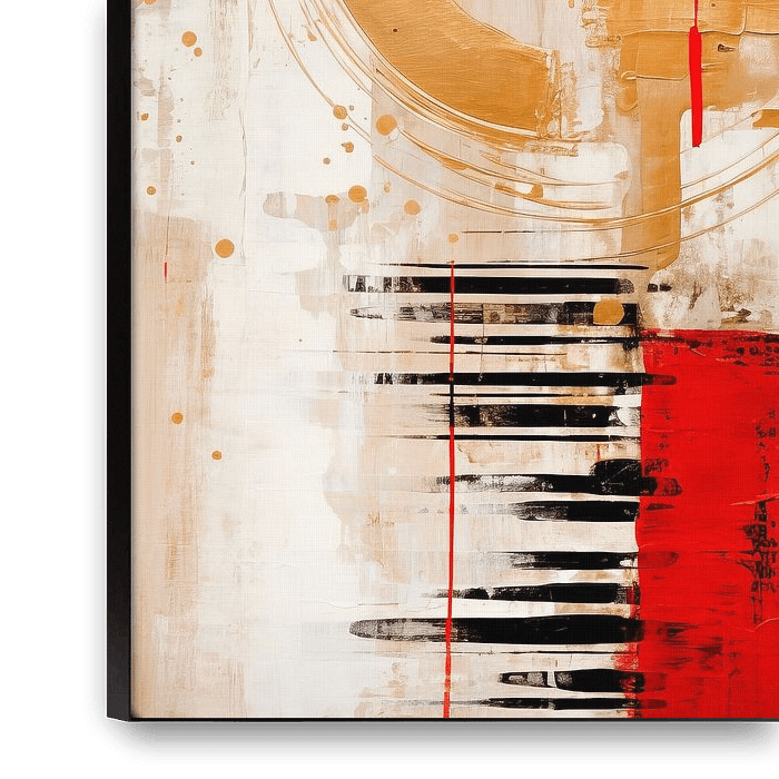 Modern art with gold-colored shapes, strong contrasts, and a texture in red and white. This abstract painting displays a festive mood. The colors blend into a harmonious warm composition.