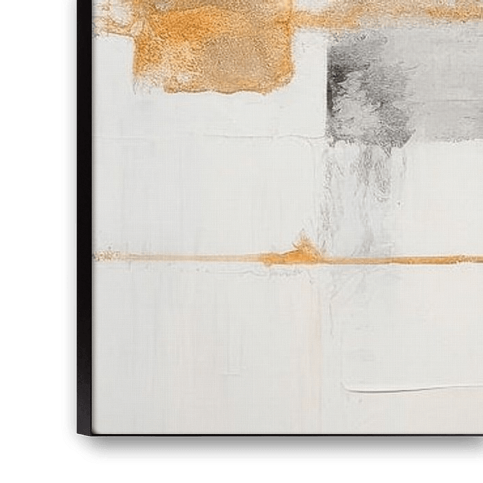 Modern art with gold-colored shapes, muted contrasts, and a texture in light grey. This abstract panoramic painting displays a timeless and calm relaxation. The colors blend into a harmonious composition.