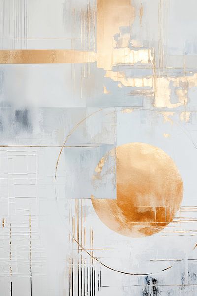 Modern art with golden geometric shapes, including circles and lines, stand out against a muted, abstract background. The design features a minimalist aesthetic with a mix of metallic sheen and soft neutral tones. This abstract painting displays a timeless and calm relaxation. The colors blend into a harmonious composition.