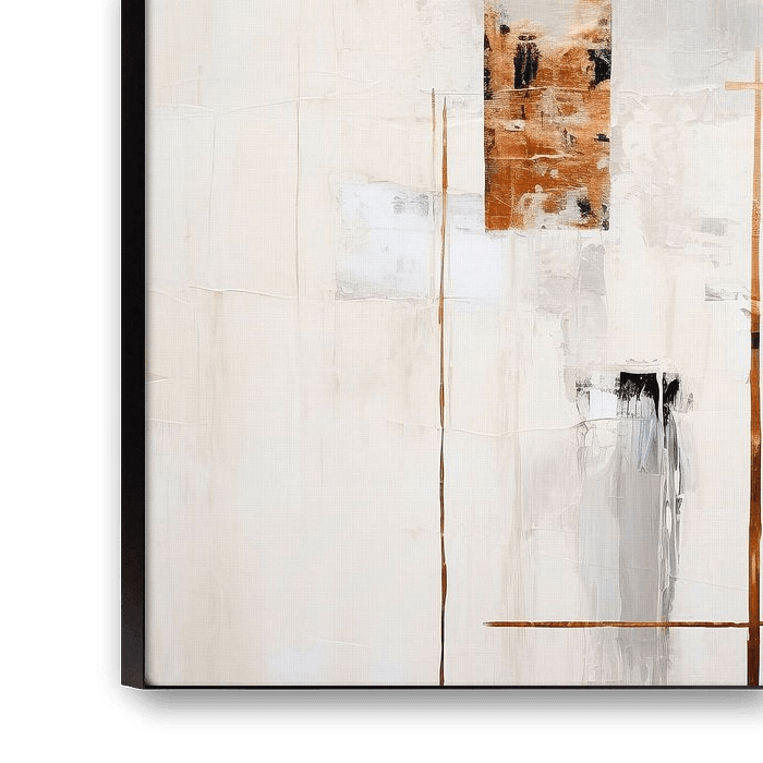 Modern art with golden geometric shapes. The design features a minimalist aesthetic with a mix of metallic sheen and soft neutral tones. This abstract painting displays a timeless and calm relaxation. The colors blend into a harmonious composition.