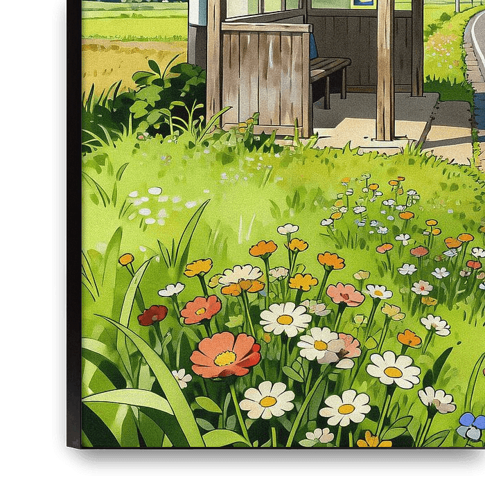 Transport your walls to a peaceful summer afternoon in Japan with this stunning ANIME landscape illustration. Inspired by the legendary Studio Ghibli art style, this piece depicts a rustic wooden bus stop nestled along a quiet countryside road. The foreground is alive with vibrant wildflowers, leading the eye toward lush rice fields and…
