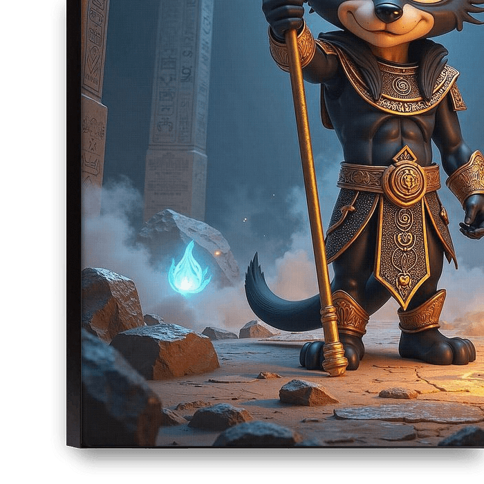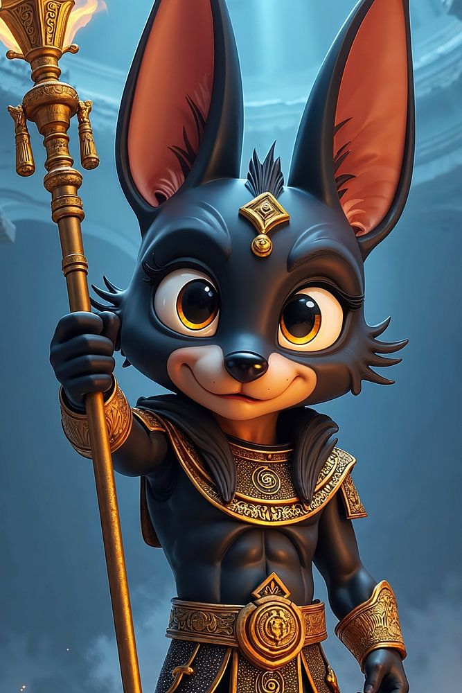 In the mysterious glow of an ancient temple rises the small yet powerful figure of Anubis, calm and watchful at once. In his hand, a golden staff shines, its flame gently burning through the darkness and bathing the space in a warm, protective light. Surrounded by massive columns, flickering reflections of light, and floating sparks,…