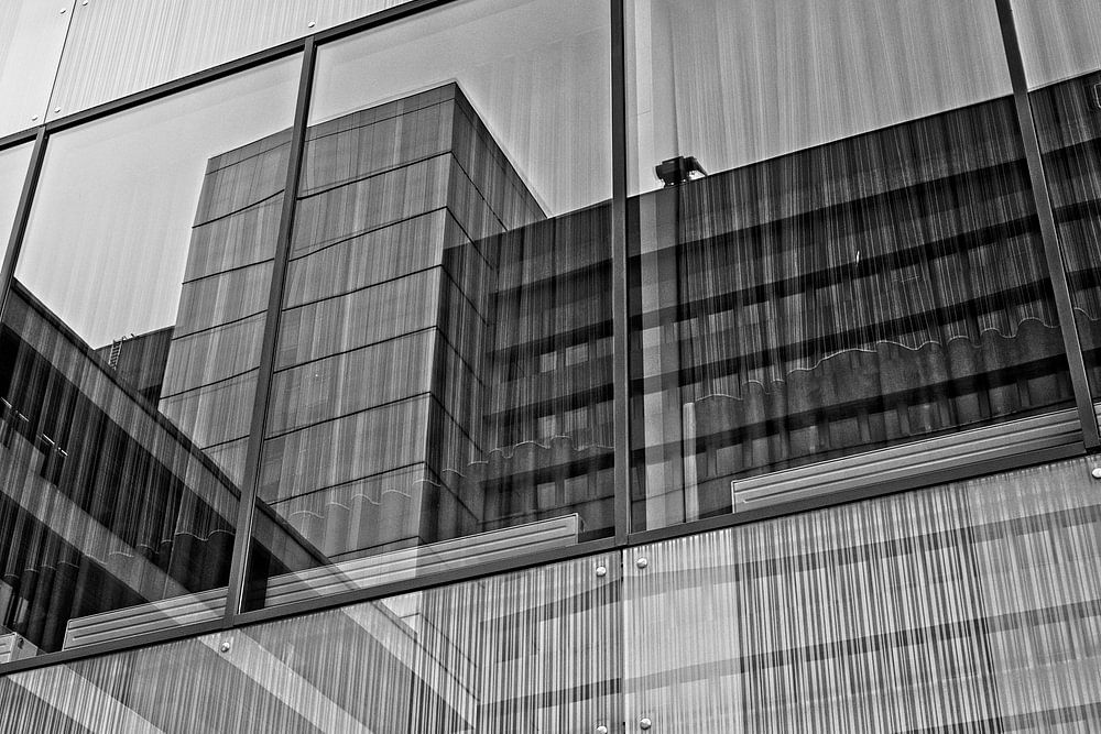The glass panels on the facades of the APG (ABP) building in Heerlen provide a beautiful reflection of the surroundings (Limburg, Netherlands). By choosing the right viewpoint, the reflection fits perfectly.