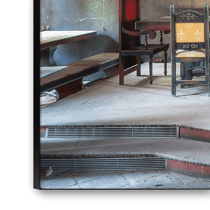 This is a photo of a stunning abandoned building with a painting of the Last Supper on the wall. Enormous sculptures and wall covering paintings were found throughout the whole place.