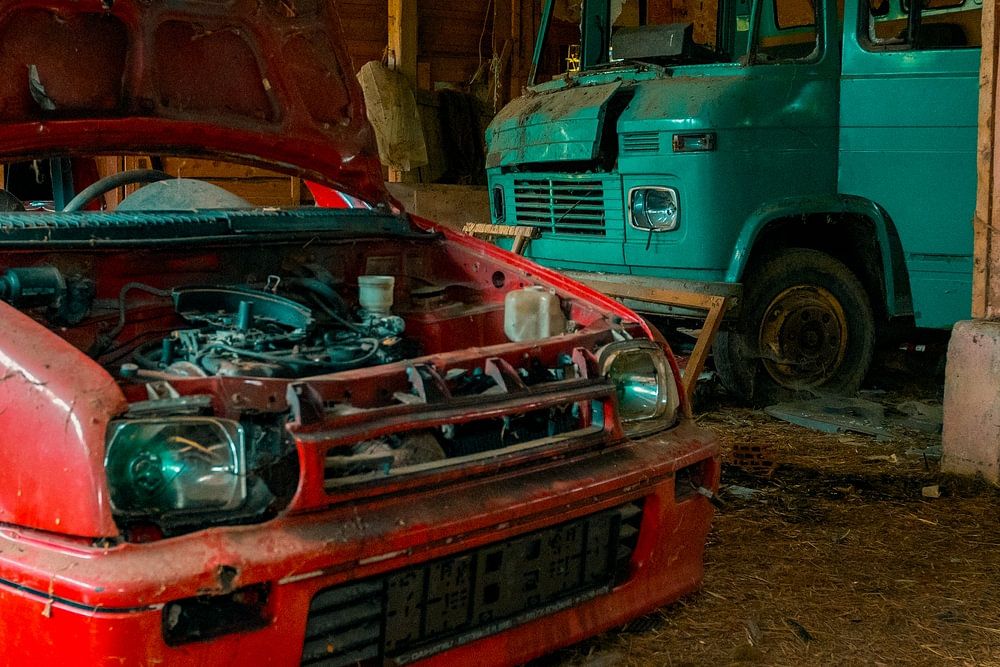 An abandoned workshop with a red car and a green truck both showing signs of long-term neglect. The workshop is dilapidated and the vehicles are in poor condition, with opened bonnets and missing parts.