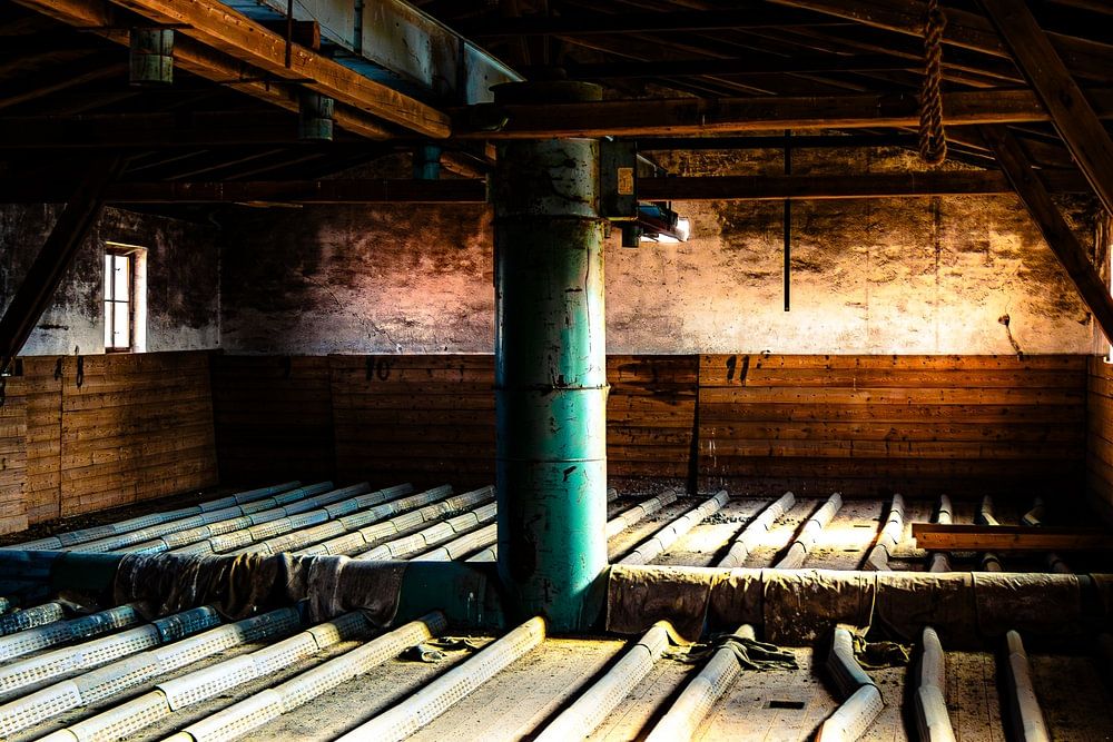 This picture perfectly captures the aesthetics of decay and arouses curiosity about the past of this place. The strong lines of the beams and pipes combined with the soft rays of light and shadows create an almost surreal, abandoned scene.