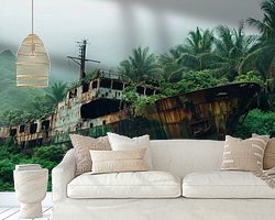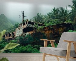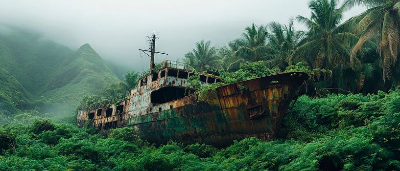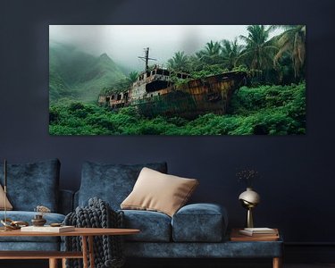 A mystical relic from a bygone era that has been reclaimed by nature. Lush greenery embraces the rusted shipwreck, while fog spreads a mysterious atmosphere. This mesmerising artwork could be perfectly placed in a living room to entertain and amaze guests, telling stories of adventures and lost places.