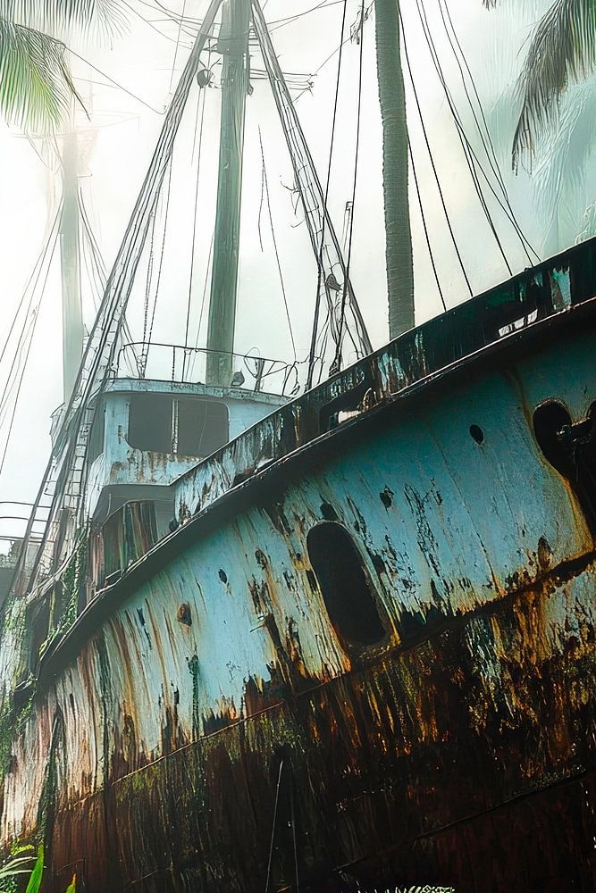 A mysterious shipwreck, surrounded by lush greenery and mystical fog, tells stories of past adventures. The rusty surface of the ship contrasts impressively with the vibrant palm trees. This fascinating motif brings exotic flair and a pinch of nostalgia to any living room, where it inspires dreams and discovery.