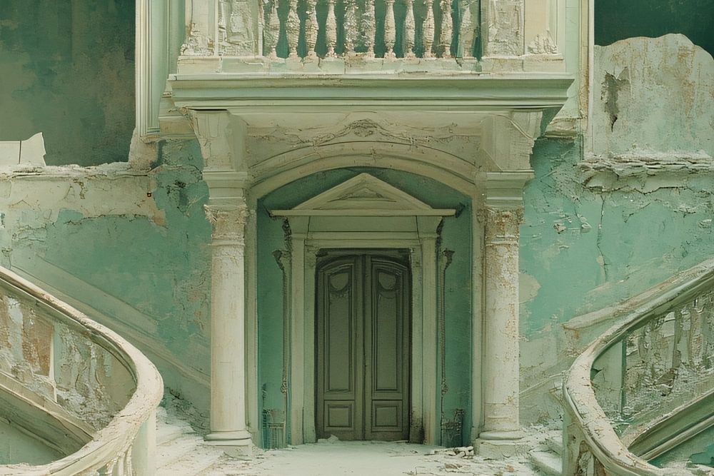 This beautiful design shows the past glory of an abandoned villa with an impressive double staircase. The walls are covered in a subtle shade of green, which is weathered and worn, giving the place a mysterious, nostalgic feel. The architectural details, such as ornate balustrades and old balconies, give a glimpse of the richness of the past. The soft tones of green and beige add a quiet, melancholic charm, making this design perfect for lovers of classic architecture and vintage style.
